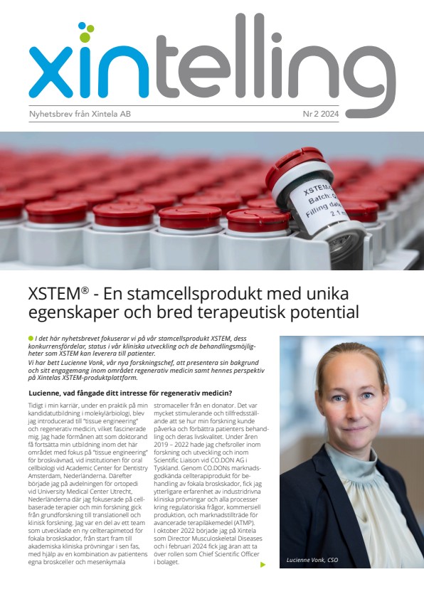 Xintela utvecklar medicinska produkter inom stamcellsterapi och målriktad cancerterapi baserade på bolagets cellytemarkör integrin α10β1 som finns på mesenkymala stamceller och på vissa aggressiva cancerceller. Inom stamcellsterapi används integrin α10β1 för att selektera och kvalitetssäkra stamceller i framställningen av den patentskyddade stamcellsprodukten XSTEM®, som är i klinisk utveckling för behandling av knäartros och svårläkta bensår. Bolaget producerar XSTEM för de kliniska studierna i den egna GMP-godkända produktionsanläggningen. Inom cancerterapi, som drivs av det helägda dotterbolaget Targinta AB, utvecklas riktade antikroppsbaserade behandlingar (First-in-Class) för aggressiv cancer som trippelnegativ bröstcancer och hjärntumören glioblastom. Xintela bedriver sin verksamhet på Medicon Village i Lund och är noterat på Nasdaq First North Growth Market Stockholm sedan 22 mars 2016. Xintelas Certified Adviser är Carnegie Investment Bank AB (publ).